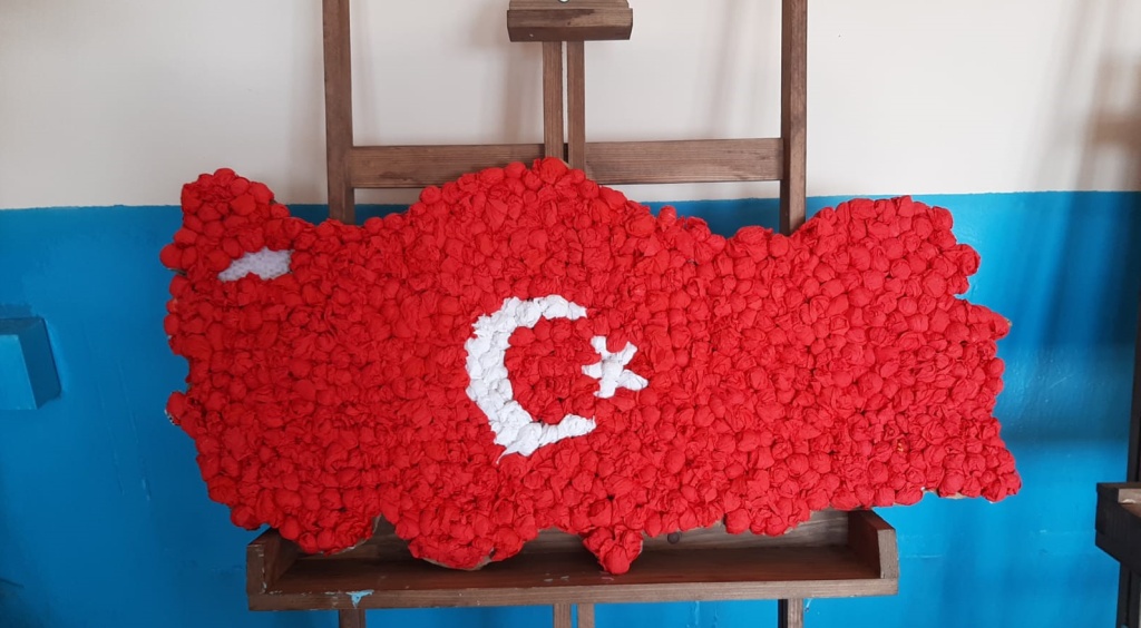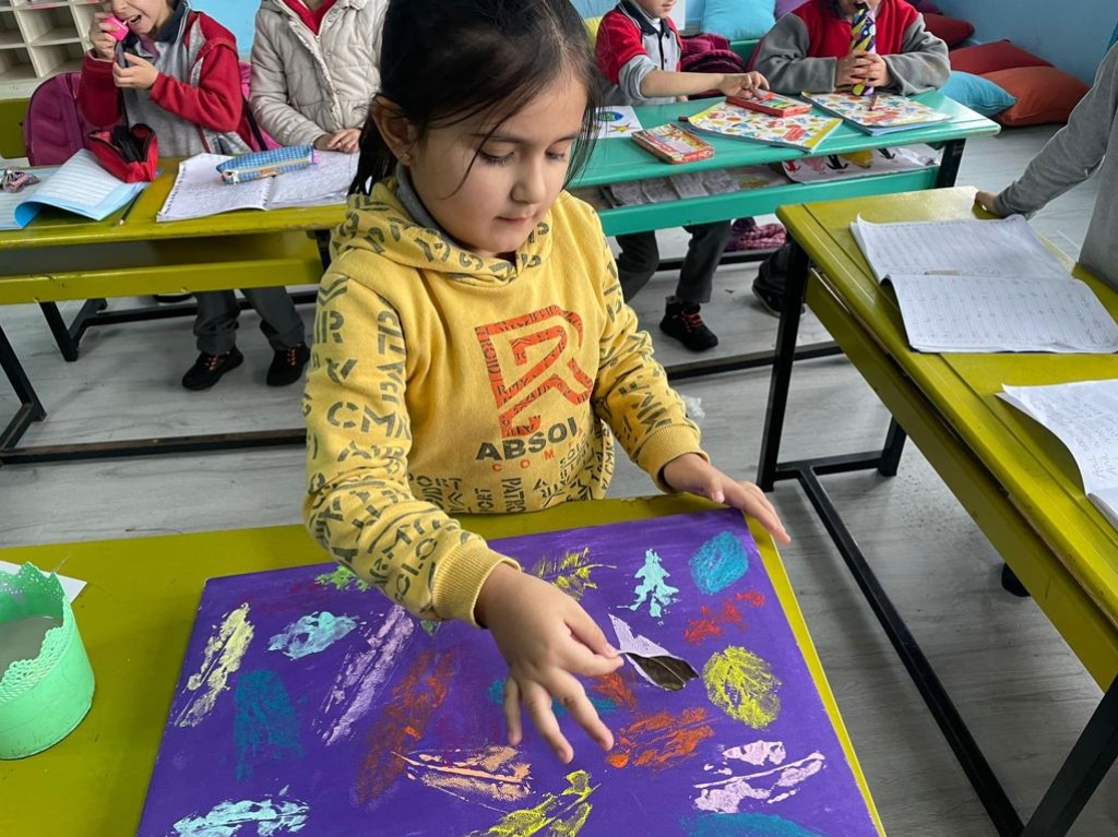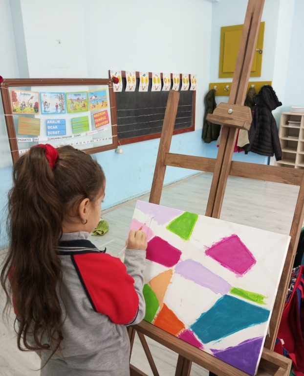 İlçe Milli Eğitim Müdürlüğümüzün öncülüğünde öğrencilerin derslerden kalan zamanlarında kendilerini iyi hissedecekleri, stresten uzak, çekici ve rahat bir ortam oluşturmak amacıyla "Resim Sevdalılarına Her Duvar Bir Tuval" projesi başlatılmıştı. Biz de bu kapsamda doğadan topladığımız materyallerle baskı çalışması yaptık. Vatan ve bayrak sevgisini aşılama amaçlı grapon kâğıdı ile yuvarla yapıştır etkinliği ile Türkiye haritası yapıldı. Vatan Şairi Mehmet AKİF ERSOY ve İstiklal Marşının önemini kavratmak amacı ile portre çalışması yapıldı. Renklerin uyumu ve tonlaması ile alakalı olarak mozaik çalışması yapıldı.